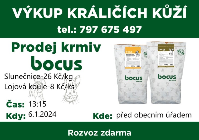 V sobotu 6.1. ve 13:15 proběhne před obecním úřadem prodej krmných směsí pro hospodářská zvířata od 335 Kč za 25 Kg, slunečnice 26 Kč/kg a výkup králičích kůží. Výkupní cena 25 Kč.